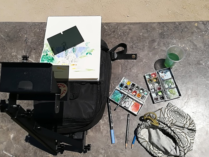 Gli strumenti del disegnatore in viaggio sono elementi che condizionano tempi e modi di realizzazione. Dall’ottocento le nuove tecnologie hanno sempre di più portato a velocizzare il modo con cui è possibile rappresentare il reale e oggi siamo nel pieno della fotografia digitale, incarnata sempre più dal proprio telefono, dove non si richiede un momento di analisi approfondita ma di rapida archiviazione e memorizzazione.